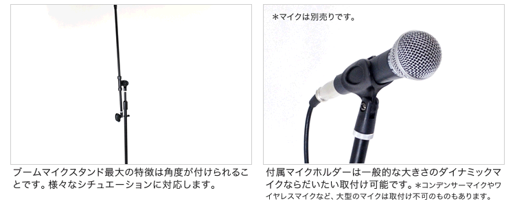 2タイプのマイクホルダーをセットで様々なタイプのマイクに対応OKな万能スタンドセット! 快適にご利用いただけます。 ブーム・アーム部分をはずせば、ストレートマイクスタンドとしても使えます。 スピーチ、講演やイベント、宴会などあらゆる場面でお使いいただけます。