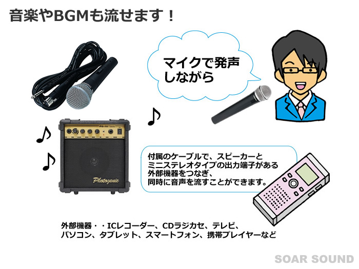 付属のケーブルでCDやテレビ、パソコンなどの外部機器の音をマイクと同時に出すことも出来ます。